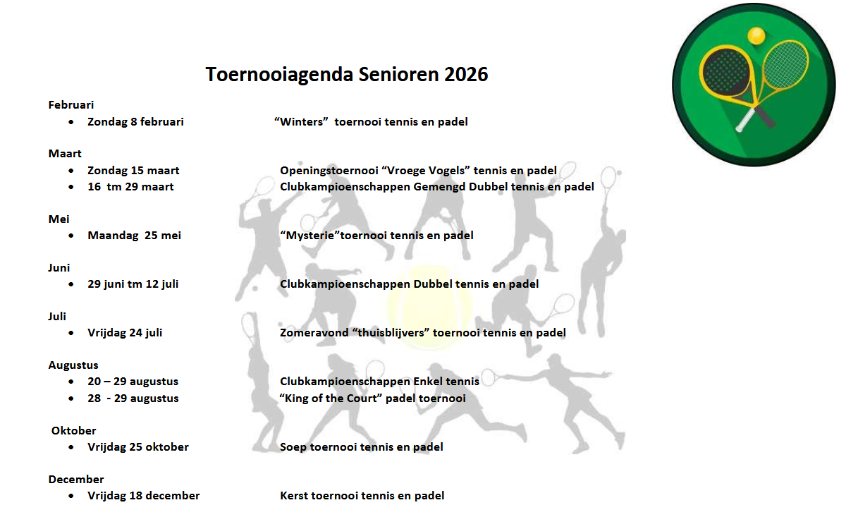 De toernooicommissie organiseert diverse tennis- en padeltoernooien gedurende het jaar. De ene keer op een avond, de andere keer een dagdeel of wat langer. Meestal worden deze toernooien als dubbelspel gespeeld en zoveel mogelijk op ieders eigen niveau ingedeeld.